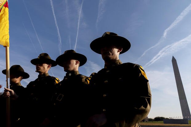 The Army's 1st Cavalry Division Honor Guard from Fort Hood, Texas stands during a Veterans Day ceremony at the World War II Memorial in Washington, Thursday, Nov. 11, 2021, hosted by The Friends of the National World War II Memorial and the National Park Service to pay tribute to those who served in WWII and the over 400,000 servicemen who were killed. (AP Photo/Andrew Harnik)