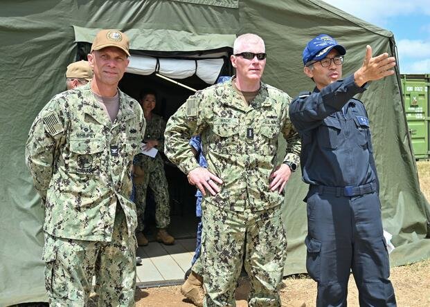 Vice Adm. John Wade (center), commander, U.S. 3rd Fleet and exercise Rim of the Pacific (RIMPAC) 2024 Combined Task Force (CTF), tours the Humanitarian Assistance/Disaster Relief (HADR) camp with Rear Adm. Kazushi Yokota (right), commander, JMSDF Escort Flotilla Three and exercise RIMPAC 2024 CTF vice commander, and Capt. Doug Whimpey (left), commodore, First Naval Construction Regiment and deputy commander, HADR Task Force, at Joint Base Pearl Harbor-Hickam, July 13. (Atsushi Mashima)
