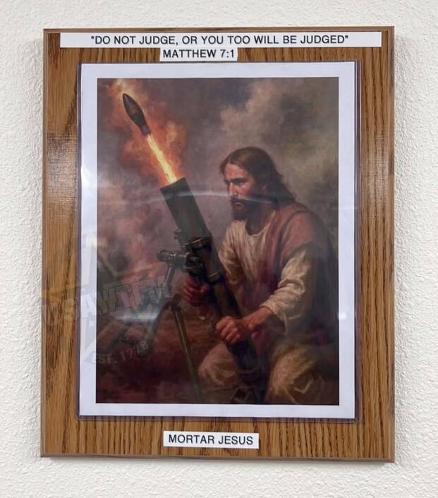 A black-and-white image was allegedly was found by three NCOs on an unnamed military installation. This image is from 2025 and in color, showing captions like "MORTAR JESUS." (MRFF)