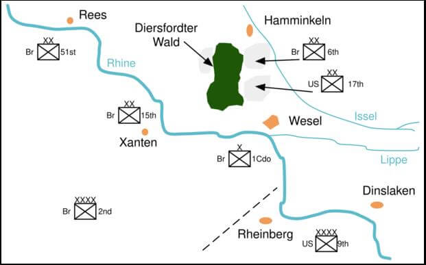 The 84th Infantry Division and elements of the 47th Panzer Corps held positions along the Rhine opposite the planned landing zones near Hamminkeln and the Diersfordter Wald, a dense forest overlooking the river.