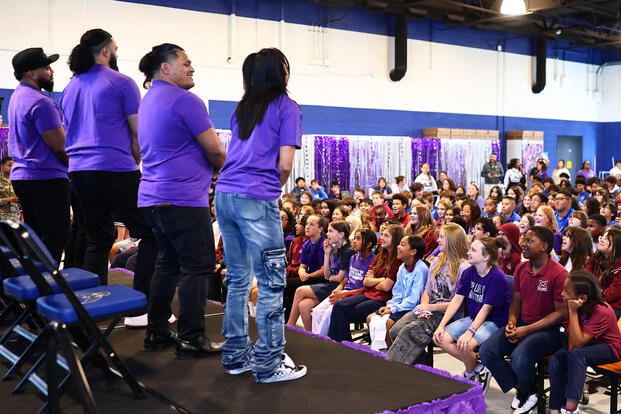 The WWE stars also visited Coral Academy of Science for a Purple Up Day assembly tied to April’s Month of the Military Child. Purple Up Day is observed each year to recognize military children, whose lives are often shaped by frequent moves, deployments and the strains that come with military service.