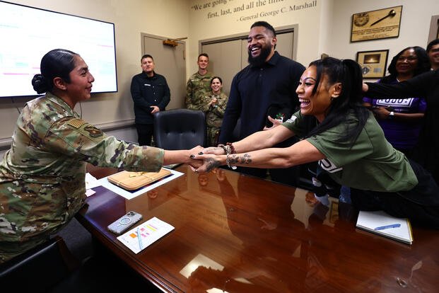 Beyond those ticket reveals, the stop at Nellis gave the wrestlers a closer look at daily life on the installation. The USO shared details showing the group sat through a mission brief, met with members of the Air Force Thunderbirds and spent time near the hangar, where they posed for photos around the jets and spoke with personnel.