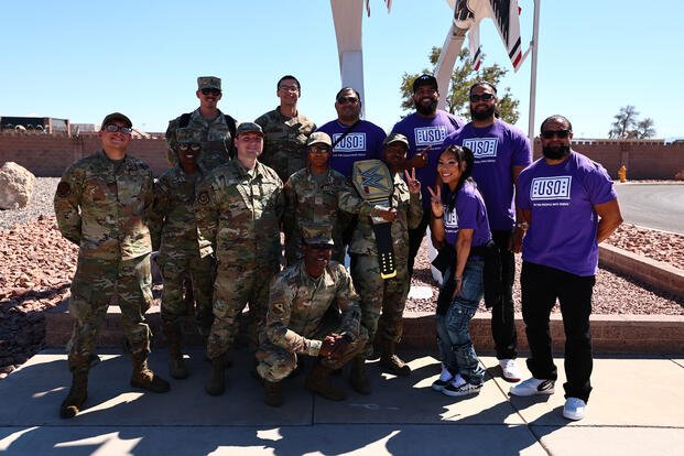 The visit featured WWE stars Tama Tonga, Tonga Loa, Taila Tonga, JC Mateo and Michin, according to information the USO shared with Military.com. The organization said the wrestlers came to Nellis to learn more about the base mission, spend time with service members and their families, and take part in events both on base and in the local community ahead of WrestleMania.