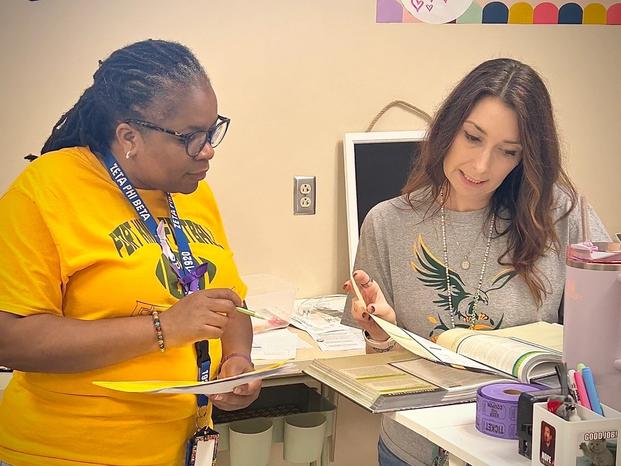 Ms. Cherese Appling, Fort Knox Special Education Teacher and Mrs. Elizabeth Spalding, Fort Knox English Teacher, plan their next lesson in a collaboration session (DVIDS).