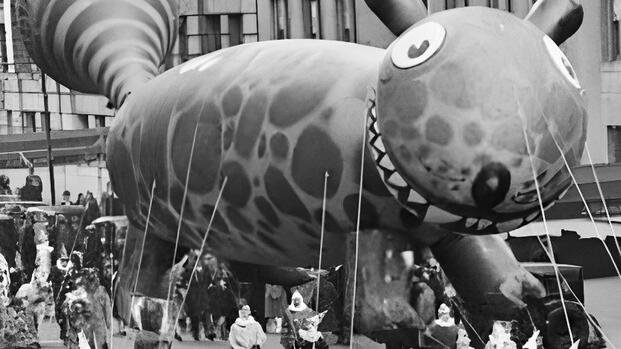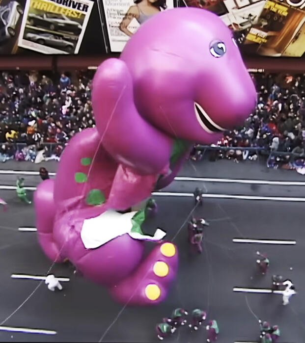 That same windy morning, Barney the Dinosaur became an unwilling Thanksgiving sacrifice. As handlers fought to keep the balloon stable, gusts ripped a hole in his side. NYPD officers ultimately tackled the balloon and stabbed it with knives to stop it from blowing down the block.