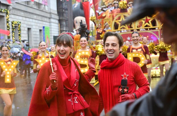 Alison Brie (as Macy's Gift Guide) cuts the ribbon to kick off the 2024 Parade. (Credit: Macy's)