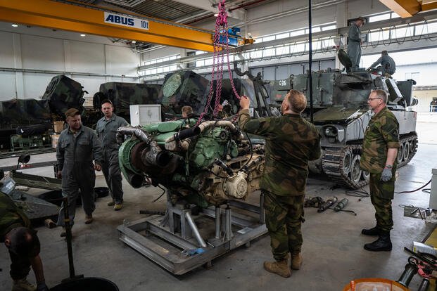 Norwegian soldiers provide M109 self-propelled howitzer maintenance training to Armed Forces of Ukraine soldiers at Grafenwoehr Training Area, Germany, May 24, 2022. The maintainer training is provided by both US and Norwegian soldiers as part of their respective country’s security assistance package. (U.S. Army photo by Spc. Nicko K. Bryant Jr., 7th Army Training Command)