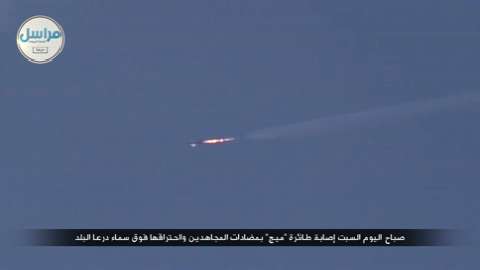 Syrian rebels engage and strike a Syrian air force MiG fighter with anti-aircraft guns near Dara. June 2014.