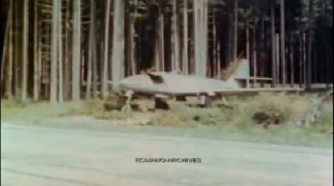 Germany, Black Forest, 1945. Allied 16mm Kodacolor film. A close look at rare German jet-fighters Me-262, abandoned on the sides