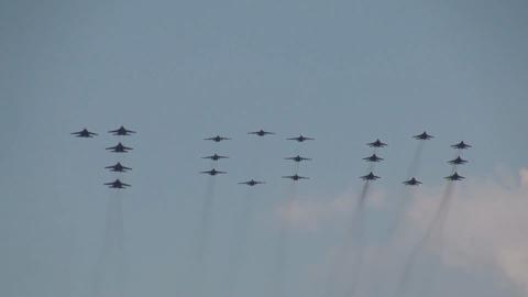 The Su-27, Su-25 and MiG-29 create an impressive formation at a Russian air show.