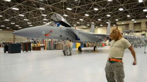 Airmen just horsing around in an F-15 hangar. Nothing to see here, folks.