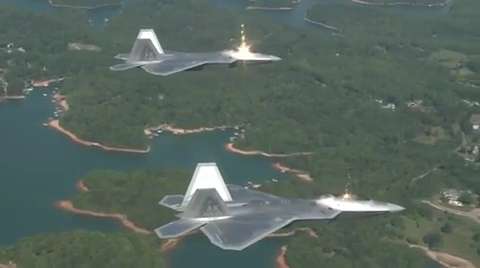 Footage of F-22 Raptor fighter aircraft taking off, landing, and performing airborne maneuvers. Provided by 94th Airlift Wing.