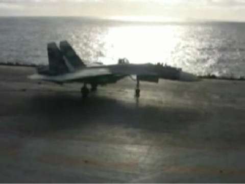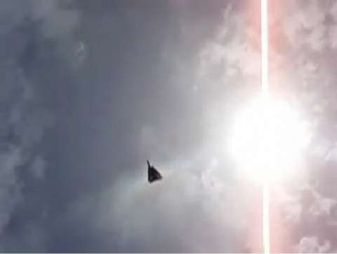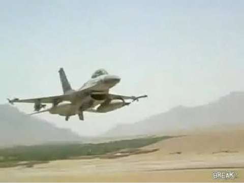 A jet fighter buzzes past a group of soldiers less than 20 feet off the ground.
