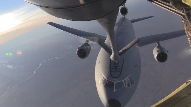 A U.S. Air Force KC-135 refuels a KC-10 in mid air over Southwest Asia.