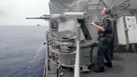The MK-38 deck gun is a chain-driven auto-cannon. It is used for shipboard defense against small, fast, and agile surface