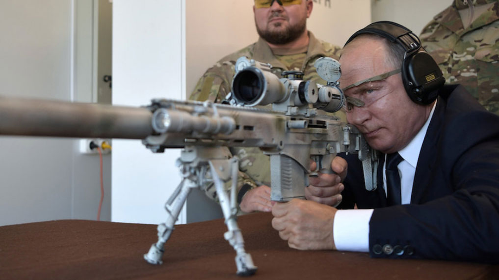 Russian President Vladimir Putin test firing the Chukavin SVCh sniper rifle in September 2018.