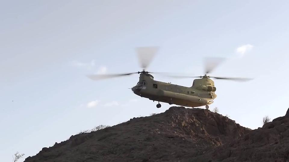 U.S. Army CH-47F helicopters from the 82nd Combat Aviation Brigade (CAB), practice low level flight maneuvers and landings in mountainous