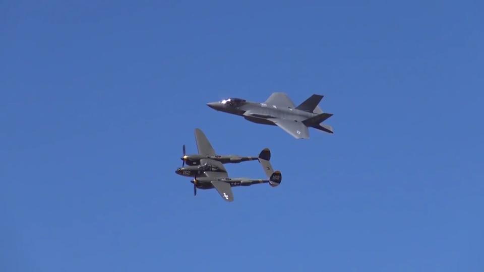 Earl Conrad, WWII P-38 fighter pilot, gets an up close look at the newest fifth generation fighter jet.