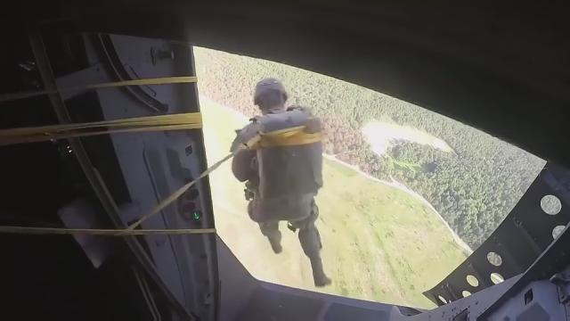 U.S. Army 82nd Airborne Division Paratroopers execute training jumps from C-17 Globemaster III planes over Fort Bragg, NC. All footage
