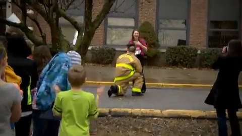 Ohio firefighter Justin Deierling surprised his girlfriend Megan Zahorec with a marriage proposal in front of the staff and students