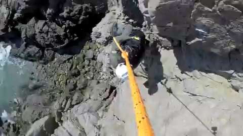 H1 rescues a dog "Oreo" trapped 40 feet down a 90 foot cliff at Portugese Beach.
