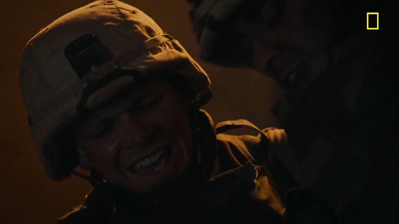 In this scene, Sgt. Eric Bourquin assists his commanding officer, Lt. Shane Aguero, back to the roof after Aguero is