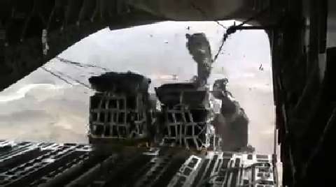 Members from the 816th Expeditionary Airlift Squadron use a C-17 Globemaster cargo aircraaft to drop precious supplies to a remote