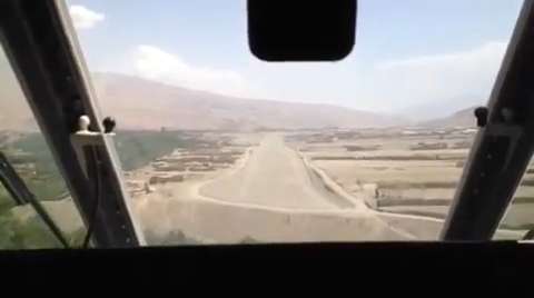 Cockpit view of aircraft landing at Bagram airport in Afghanistan.