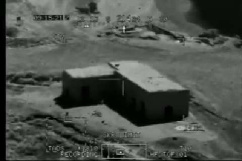 Taliban fighters hiding in a building get hit with a Hellfire missile from U.S. Apaches.
