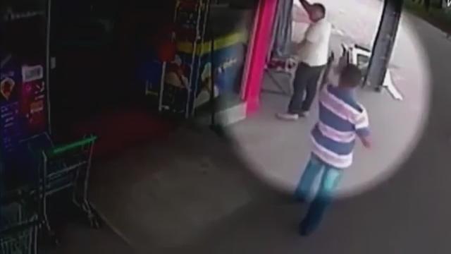 Intense CCTV footage shows a gunman in Brazil missing his target THREE TIMES at point blank range.