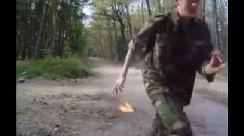 A soldier jumps on a Molotov Cocktail and tries to outrun the explosion. Not the brightest idea...