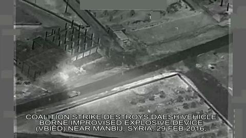 29 FEB 2016 - A Coalition airstrike on a Daesh vehicle borne improvised explosive device (VBIED) near Manbij, Syria, to