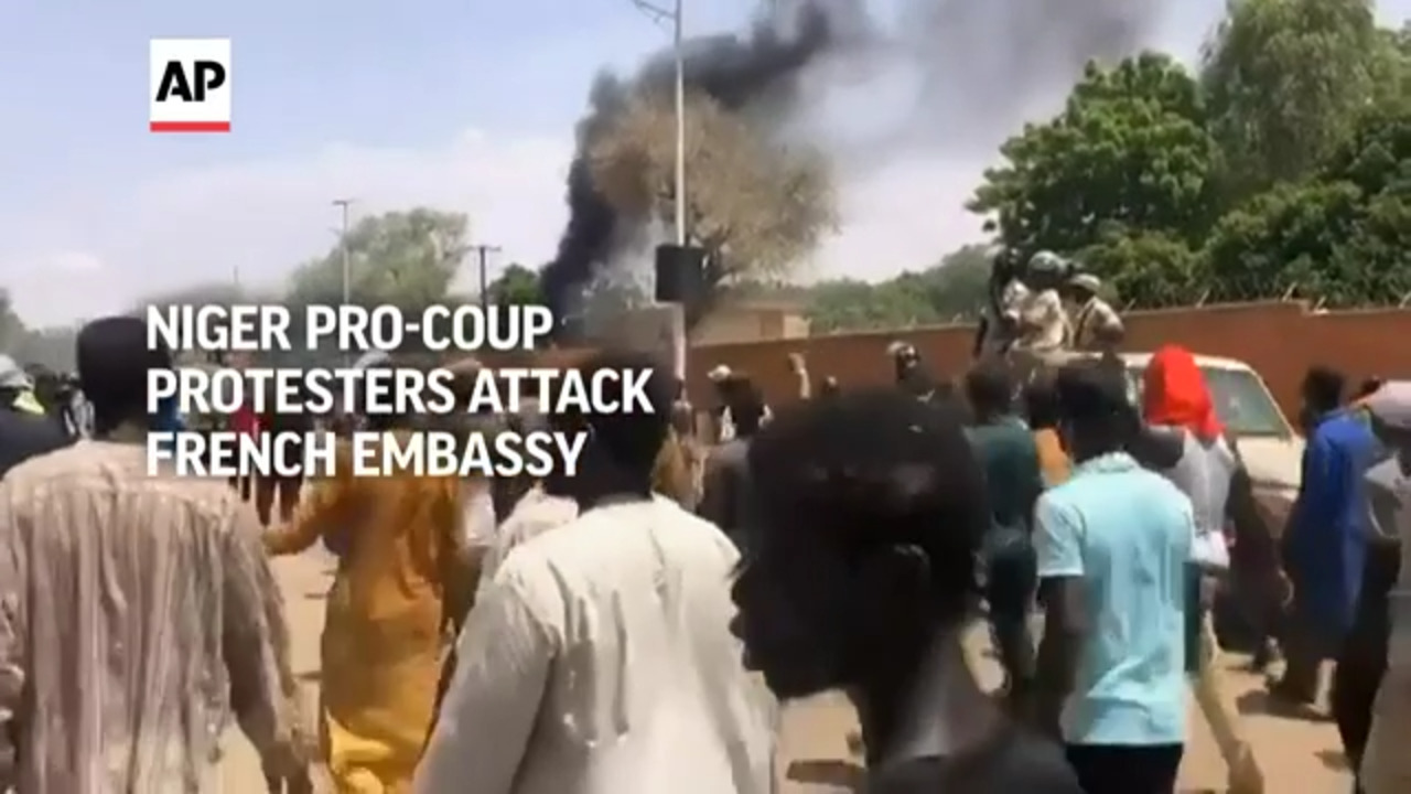 A door at the French Embassy was set ablaze as thousands pro-coup protesters marched through the streets of Niger's capital