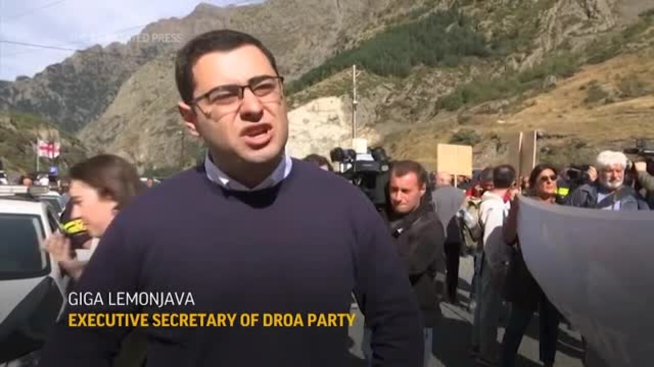 Protesters gathered at the Georgian-Russian border crossing in Larsi on Wednesday as long lines of Russian citizens continued to arrive