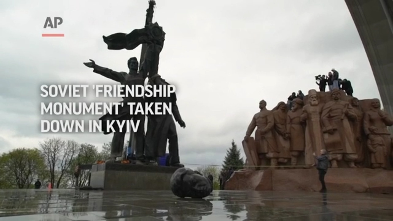 Ukrainian authorities dismantled the Monument of People's Friendship on Tuesday, a statue overlooking the Dnieper River in Kyiv, representing Russian-Ukrainian