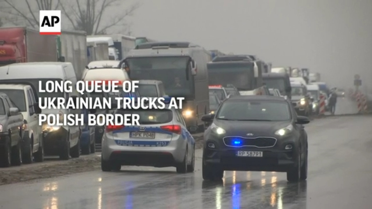 Trucks and other vehicles carrying humanitarian aid were queued to enter Ukraine from Poland's Medyka border station on Saturday. (April