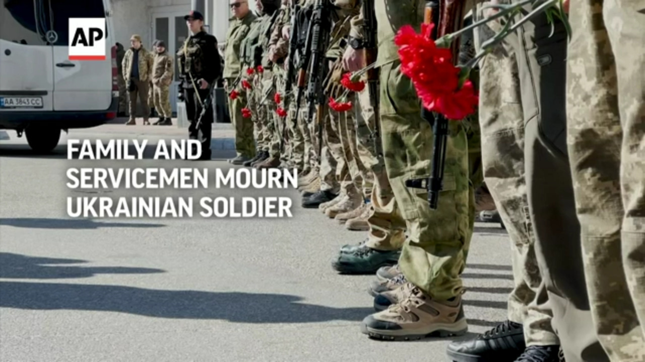 Family members and Ukrainian servicemen attended the funeral ceremony of marine Alexandr Khovtun, in Kyiv, on Sunday. (Associated Press)