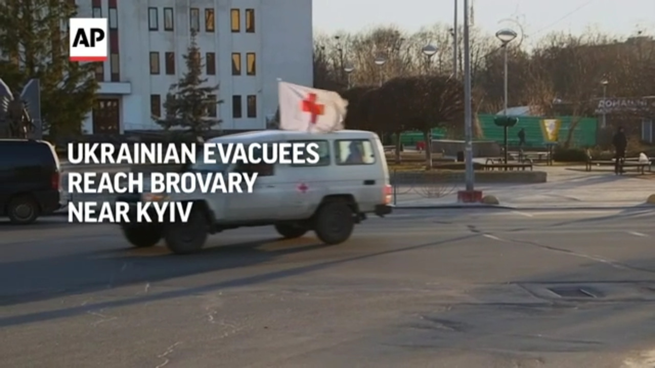 A convoy of vehicles carrying residents evacuated from the Ukrainian village of Bobryk arrived in Brovary, a city east of