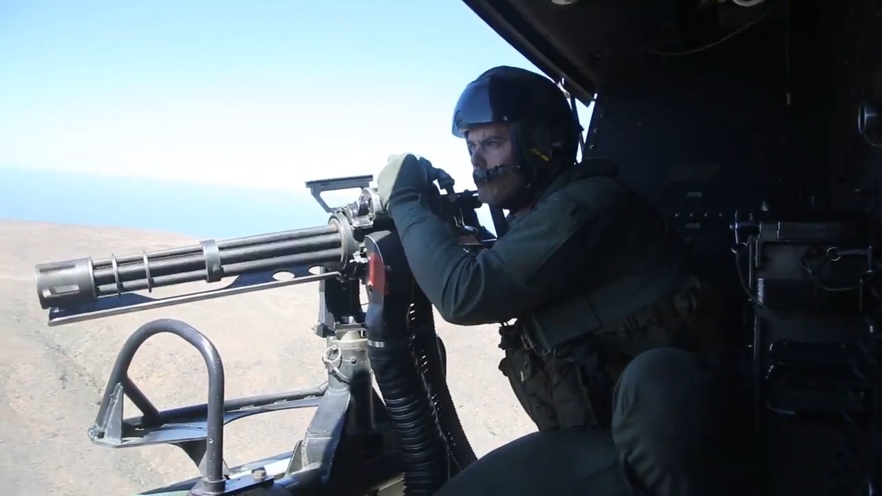 Members of Marine Light Attack Helicopter Squadron (HMLA) 369, Marine Aircraft Group 39, 3rd Marine Aircraft Wing, conduct live fire