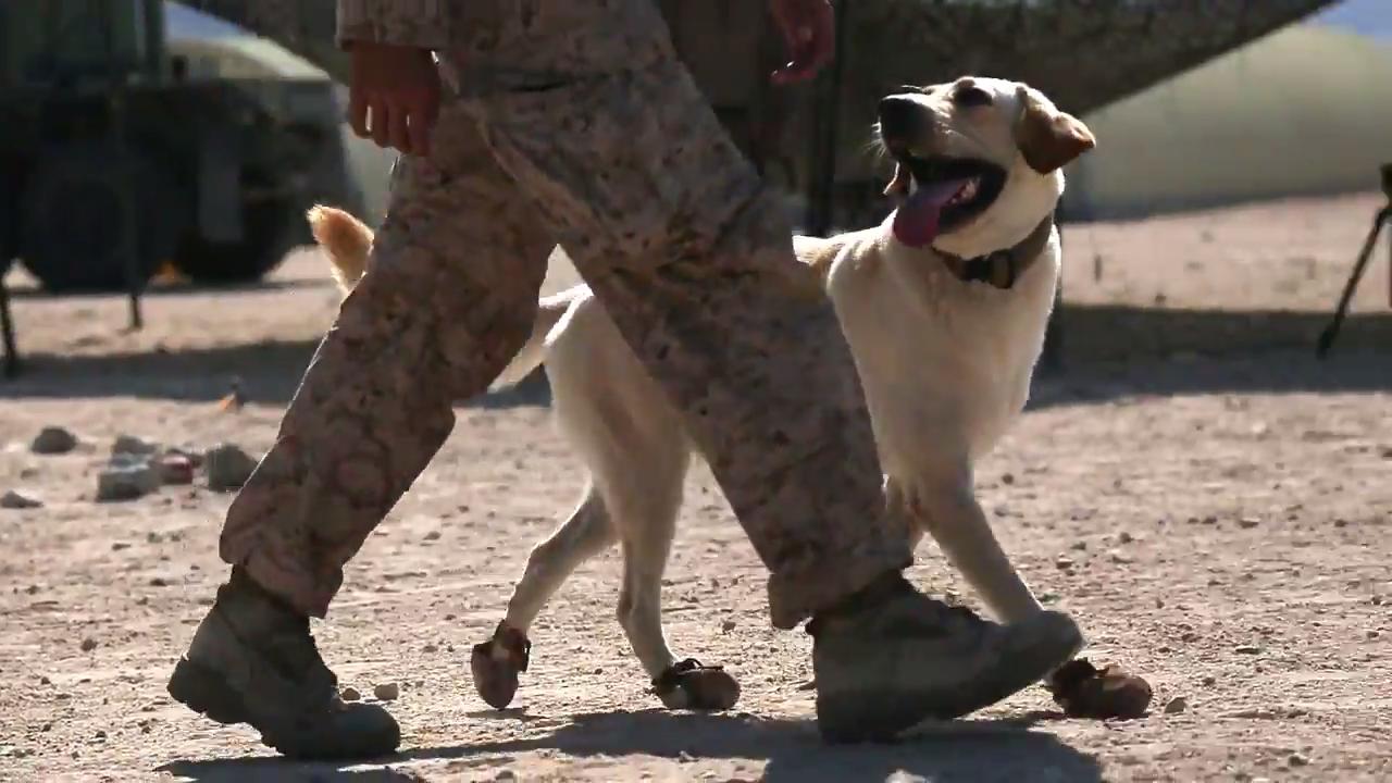U.S. Marine Cpl. Dakota R. Harris, military working dog handler, and his dog, Dude, demonstrate military working dog capabilities during