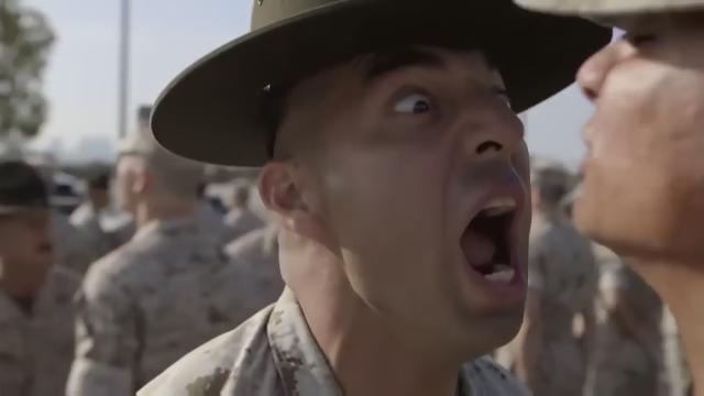 Drill instructors with India Company, 3rd Recruit Training Battalion, Recruit Training Regiment, conduct an inspection of recruits on May 13