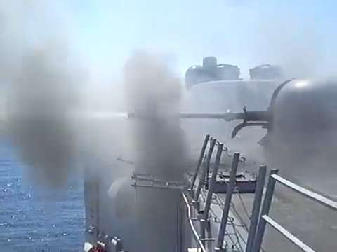 The 76mm gun on a Frigate firing a few rounds into the Atlantic. If you look closely at the end