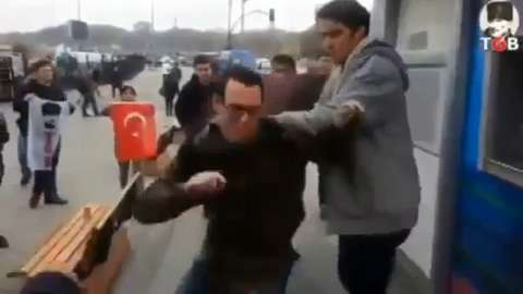 A Turkish group described as an anti-American gang threw red dye and put bags over the heads of three U.S