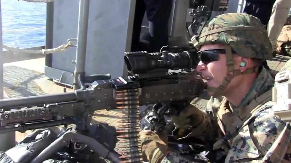 Machine gunners with Battalion Landing Team, 3rd Battalion 5th Marines, 31st Marine Expeditionary unit fire the M240G at a killer