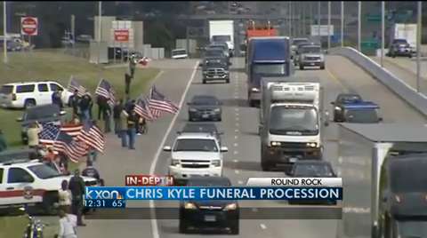 The miles-long funeral procession that began in North Texas for slain ex-Navy SEAL Chris Kyle arrived in Austin around 12:30