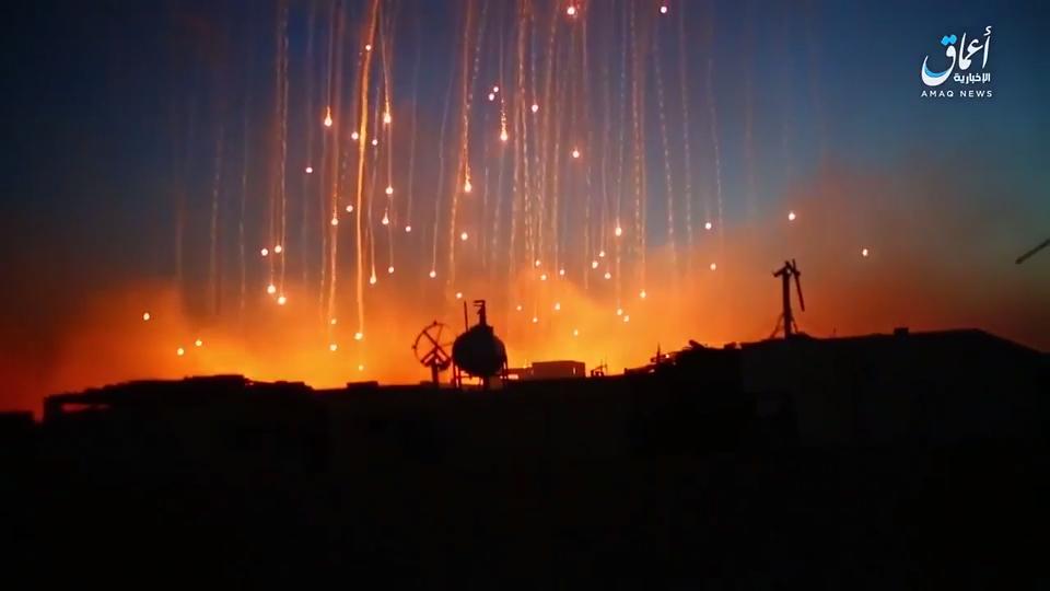 Coalition forces shell ISIS with white phosphorus in Raqqa, Syria on June 8th.