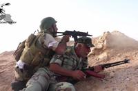 Close air support for Syrian government forces by Mi-24 gunships in eastern Syria. Firefight between Syrian soldiers and entrenched terrorists.