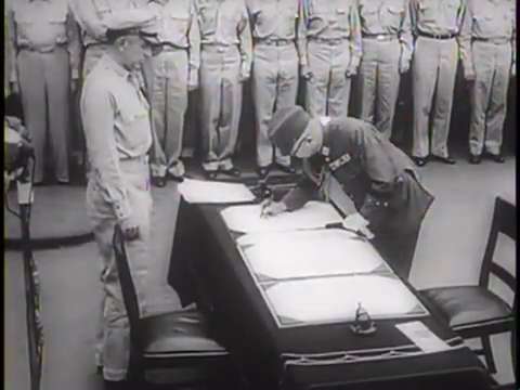 Japanese leaders sign the Japanese Instrument of Surrender on board USS Missouri as General Richard K. Sutherland watches, September 2